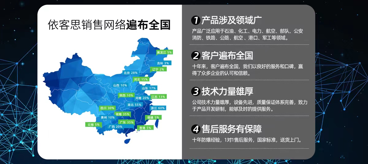 依客思防爆專(zhuān)注于防爆產(chǎn)品的研發(fā)、生產(chǎn)與銷(xiāo)售,主要產(chǎn)品有:防爆操作柱、BXCQ防爆靜電釋放儀、BZC系列防爆操作柱、不銹鋼現(xiàn)場(chǎng)操作箱、BXM(D)防爆照明(動(dòng)力)配電箱、BXX防爆檢修箱、BXJ防爆接線箱、LED防爆燈、防爆管件、防爆風(fēng)機(jī)等產(chǎn)品,型號(hào)規(guī)格齊全,廣泛適用于煤炭、電力、醫(yī)藥、石油、化工、航空等領(lǐng)域。我公司產(chǎn)品質(zhì)量過(guò)硬,價(jià)格實(shí)惠,銷(xiāo)售范圍廣,且與各大型企業(yè)建立了良好的合作關(guān)系,同時(shí)還遠(yuǎn)銷(xiāo)中、東亞和北美等地區(qū),深受用戶(hù)喜愛(ài)與青睞。